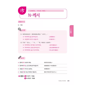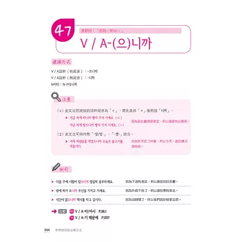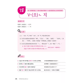 說明運用此文法時,該如何與其他詞類接續,尤其隨著接續的詞類有無尾音,常會有不同的連接方式,此部分清楚列出該文法接續各種詞類時的變化,讓您一目了然,文法運用變得好簡單!