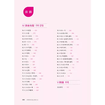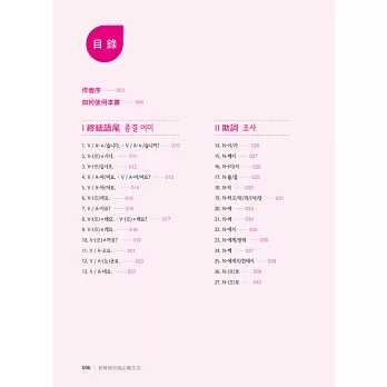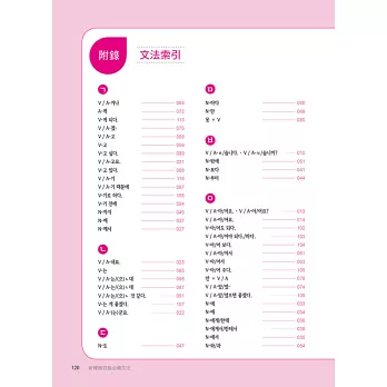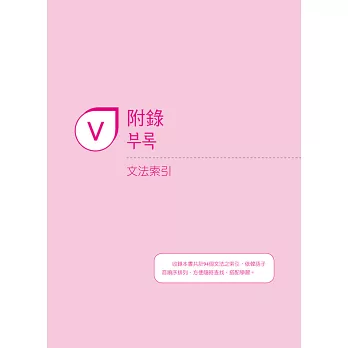文法索引收錄本書共計94條文法之索引,依韓語子音順序排列,方便隨時查找、搭配學習。