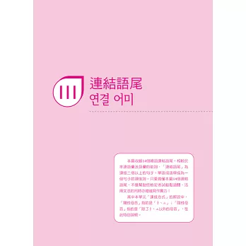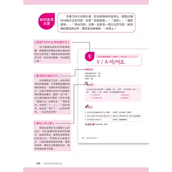 本書依文法特性,將94個文法分為「終結語尾」、「助詞」、「連結語尾」及「其他句型」四大類,讓您用正確的文法觀念打下紮實韓語基礎,學習輕鬆上手。