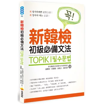 而《新韓檢初級必備文法 TOPIKI필수문법》一書,就是崔峼熲、高俊江、朴權熙、柳多靜四位名師,累積多年實際教學經驗與研究成果,專為不知如何準備TOPIKI考試的學生,所打造的文法專書!目的就是希望所有莘莘學子,在從本書獲得文法知識的同時,還能釐清文法盲點,一舉考過TOPIKI閱讀、聽力二科!