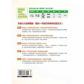 一本書即讓您掌握TOPIKI文法關鍵、釐清文法盲點。詳細內容說明如下: