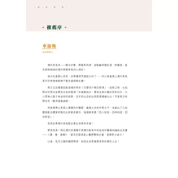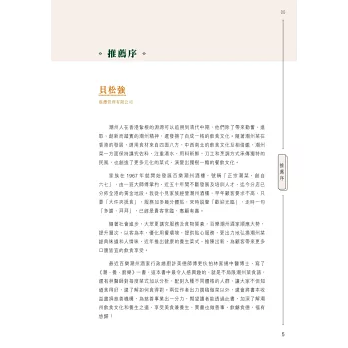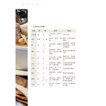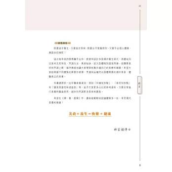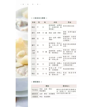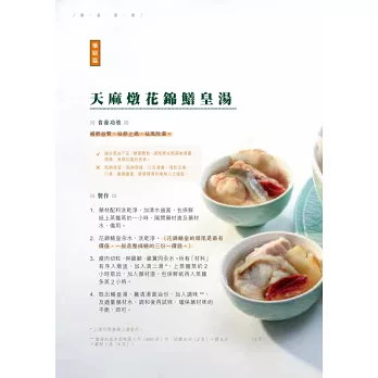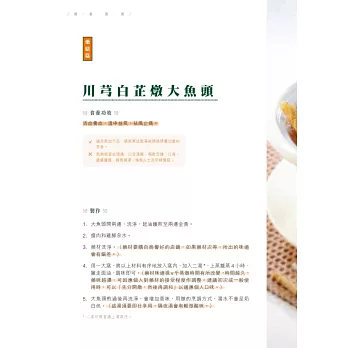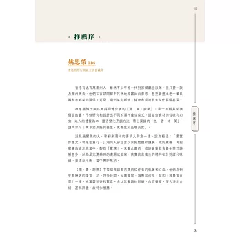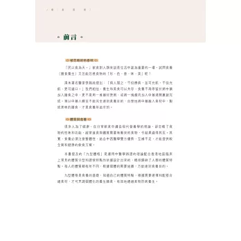 一本由專業大廚與中醫聯手炮製的食療書。兩位作者皆祖籍潮州,潮州人歷來特別注重飲食養生,由日常的茶飲到食材搭配都很講究,中醫食養更講究「三因、兩意、一忌」,本書結合醫與食的專業,精挑細選四十一道,包括湯、葷素菜餚、主食和小點,全部有食養功效說明、食用宜忌、主要食材解構、體格選食分析,每道菜還有一種主要食材/藥材的詳細介紹。在未進入菜餚製作之前,有詳細的寓養於食篇章,說明潮州食製與養生的關係,又有「自我認測九型體格」量表,幫讀者認清自己的體格,附錄「體格點菜速查表」,方便外出用膳時按體格點菜,從而達到因人制宜的食養目標。