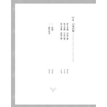 「日常行程」部分可分為三章,分別是早晨之樂、午後之樂和傍晚之樂。這些時刻組成了我們的日常生活,當中的細節卻鮮少有人討論,但其重要性和意義絕對不容忽視。從早上如何起床,到晚上如何事先安排明天的早餐,都會一一細述。講究這些細節,是讓生活開啟愉快新篇章的關鍵。
