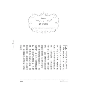 家是外在真實世界的縮影。居家生活越有品質,外在氣質越是自然優雅,越能接近時尚夫人那種「一派瀟灑卻家事全上軌道」的境界。這種自信會在潛移默化之間改變你的態度,進而令人感受到你身上那種莫名的神祕,而那,正是法國女人「難以言傳」的時尚感。