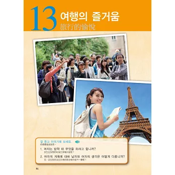 你聽過韓國的神話故事嗎?你知道首爾市的象徵「獬豸」是什麼樣的動物嗎?韓國街上處處有「美麗的商店」,其中有什麼奧祕嗎?你知道韓國男人的兵役制度嗎?這些韓國獨有的文化,透過每課的「文化漫步」單元來了解,另外還詳附「文化Q&A」,讓你對韓國文化印象更加深刻。