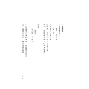 他曾在訪談中如此自述:「對於我來說,『無我』就是不再尋找『我』,我做我要做的一切,但是我不抱有目的。一切目的和結果讓命運去安排,讓各種機緣去安排。當我從目的中解脫出來之後,大地就是我的道路。」(註二)即便如此,在看似無序的書寫中,仍有些洞察和靈光,不時敲擊;我們摘下熟了的果子/我們創造早已成功的東西〈案〉;我們寫東西/像蟲子 在松果裡找路/一粒一粒運棋子/有時 是空的〈我們寫東西〉