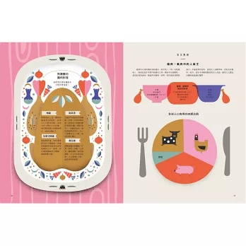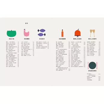 4.一目瞭然的分類方式,包括:來自大地(從土地收穫的食材)、來自農場(肉蛋奶類、起司、肉腸、蜂蜜)、來自海洋(海鮮、海藻)、來自儲藏櫃(調味料、香料、米麵食、麵包、果醬、巧克力等)、餐桌上的食物(三明治、拉麵、漢堡、沙拉、壽司、聖誕大餐、馬卡龍、提拉米蘇、蛋糕等世界美食)、吧台上的飲料(茶、咖啡、啤酒、雞尾酒、威士忌、香檳、葡萄酒、伏特加等),以及其他飲食須知:從公制、英制度量單位的轉換表,到食材的盛產季、怎麼選購適合的廚房刀具。