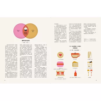 1.以頂尖設計師的插畫來表現流程圖、圓餅圖、文氏圖、蜘蛛圖等經典圖表,將知識與資訊化繁為簡,輔以食譜、步驟教學與歷史演進表,構成這本知識與視覺美感兼具的新形態百科。