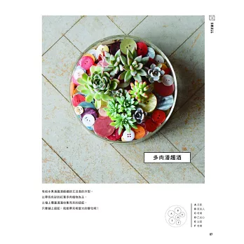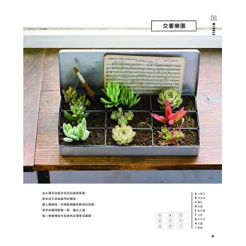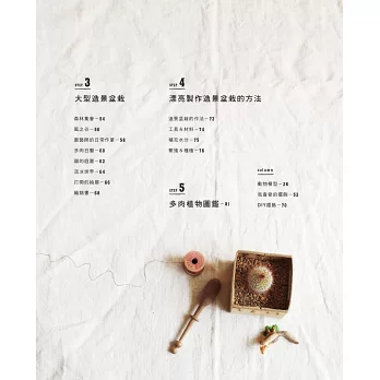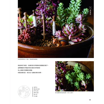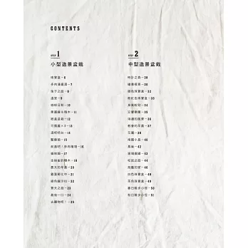 本書的造景和一般組合盆栽的差別在於,每一個造景中,都有著一段故事。只需將植物和喜愛的雜貨組合在一起,便能展開一段以它們為主角的故事。一起來試試看,抱著玩心以自己的喜好自由地組合吧!歡迎來到全新的造景盆栽世界喔!
