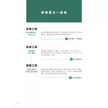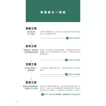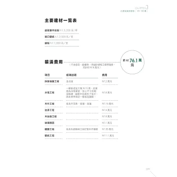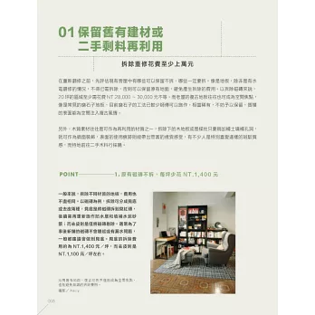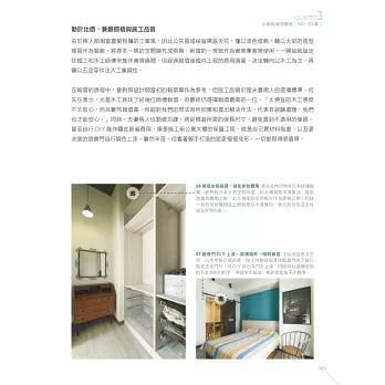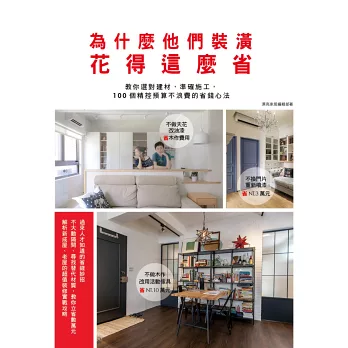 邀集新世代小資屋主現身說法,攤開自己的裝修計畫書與比價預算表,解析小坪數、一般公寓、新成屋、中古老屋的超值裝修實戰攻略,不論是自力裝潢、找設計師規劃自行發包還是全權委託設計師,都能找到最近似參考範例!