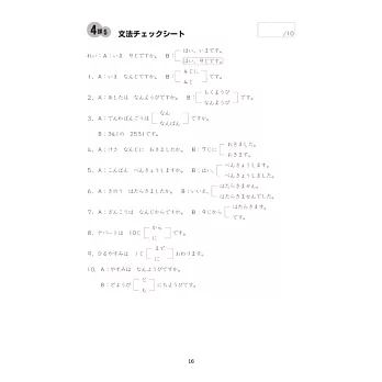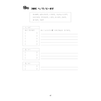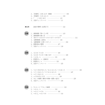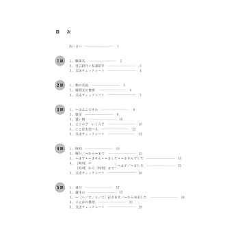 統整初級重點句型及詞彙,幫助理解正確用法,培養書寫能力。每課課後均附有「文法チェックシート」,便於立即檢測學習結果。