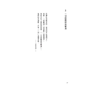 20世紀最偉大的文豪——卡夫卡,創作雖為後世讚嘆,短暫的一生卻多病、不得志、牢騷滿腹。本書結集他的各種消極話語,與其說讀著、讀著,心情愈來愈低落,不如說反倒湧現一股力量。