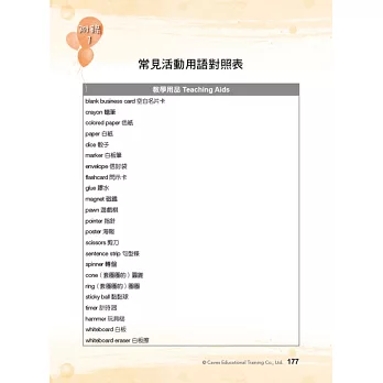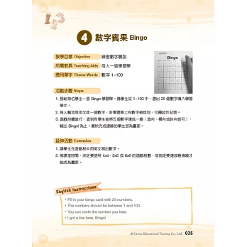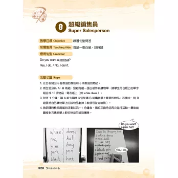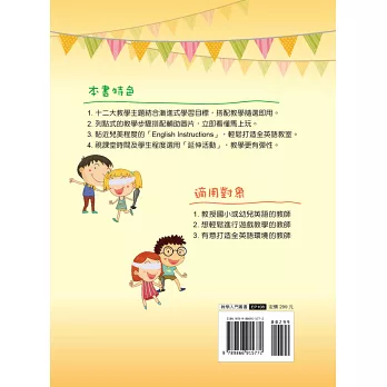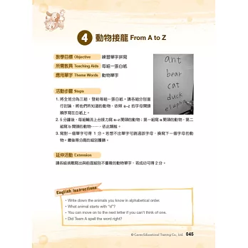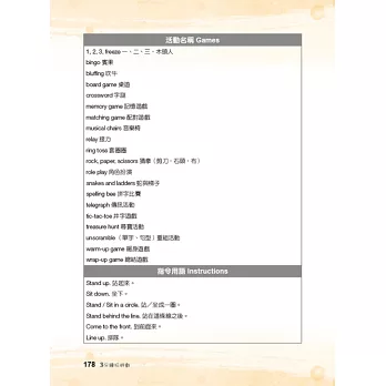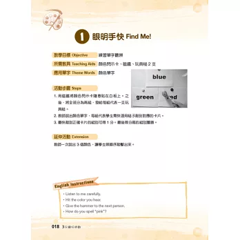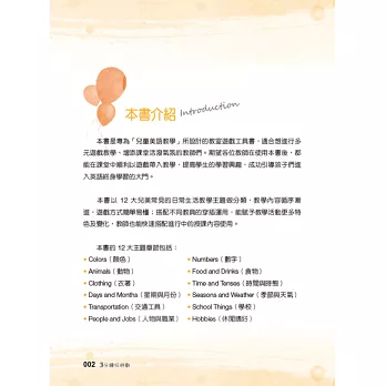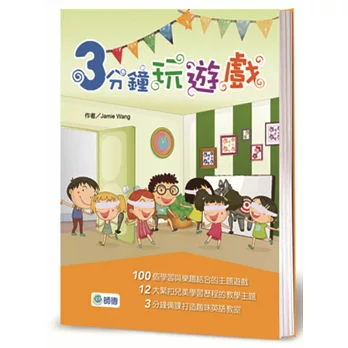 「3 分鐘玩遊戲」是專為兒童美語教學所設計的教學遊戲工具書,以 12 大兒美常見的日常生活教學主題做分類,教學內容循序漸進,遊戲方式簡單易懂,穿插搭配不同教具及學習單使用,能幫助教師以遊戲帶入教學。