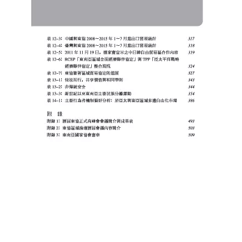表12-6:RCEP「東南亞區域全面經濟夥伴協定」與TPP「泛太平洋戰略經濟夥伴協定」整合現況 324