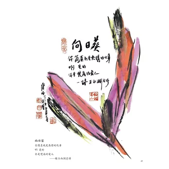 它以水墨為主軸,選用台灣當代詩人從楊華(一九○六─)到鍾昀融(一九九五─)等一百八十家的詩句,兩者互為主體,水乳交會,自五四迄今約八十年間,請問有誰能以八十六歲高齡幹過這種傻事。