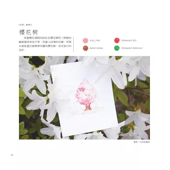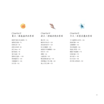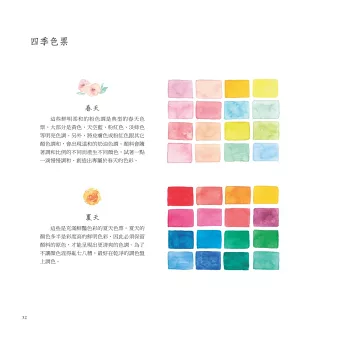 粉嫩的春、熱情的夏、蕭瑟的秋、泠冽的冬,每一個季節都有專屬的顏色,在主要的基調內,搭配出最協調的色彩。每幅畫作都詳細列出使用的顏料,可以作為參考依據,也可以依喜好重新搭配。