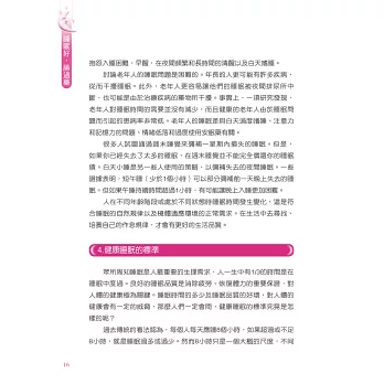 科學性:本書從睡眠的過程、對睡眠認識的九大誤區、夢的奧秘、從中醫觀點認識夢、不同年齡和不同族群的睡眠與健康、飲食與睡眠健康、睡眠障礙與健康等角度,帶您全面性地認識睡眠。