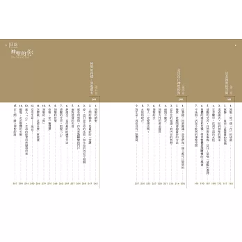 如果說《全部的你》勾勒出一幅全部生命的藍圖,那麼,《神聖的你》就是這一藍圖點點滴滴的落實。本書十分著重在執行的層面,除了教你如何在眼睛看、耳朵聽、觀呼吸……等日常行為中隨時回到「這裡!現在!」,只要對瞬間友好,不再提出抗議,可以全部接受,它自然幫助我們讓人生比較好過,樣樣都順起來。就算沒有順起來,還是接受,它也就自然好轉。