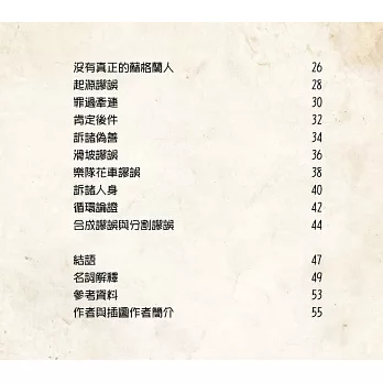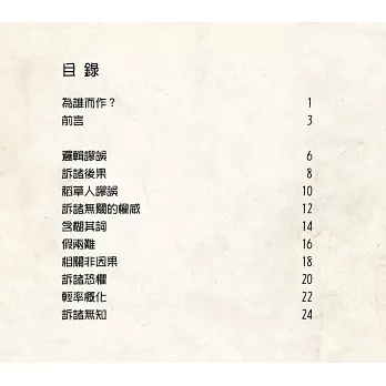 在這裡,我們要把生活中常見的錯誤邏輯通通說清楚、講明白,讓你知道什麼叫做稻草人邏輯謬誤、滑坡邏輯謬誤、訴諸人身攻擊等。你還會見到一群超萌的動物,把這本書裡面所有邏輯謬誤通通犯了一遍!(雖然如此,但牠們還是很可愛啦!)