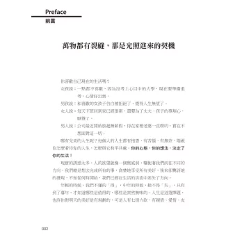 有裂縫,才看得見陽光;有希望,才跨得過困境。抱怨無法改變現實,勇敢面對,危機才會有轉機。