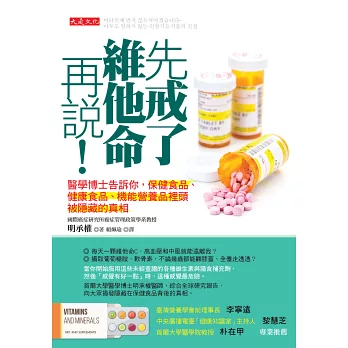 在韓國有「國民主治醫師」稱號的明承權醫師,這次在臺灣出的醫普專書──《先戒了維他命再說!》,和我的觀念不謀而合,更高興有專業醫師提出實證及理論來支持這個論點,以避免民眾盲目的花錢又傷身。