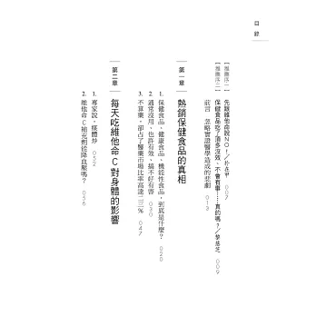 筆者撰寫本書之目的在於,秉持實證醫學的精神,以科學角度的最新人體臨床研究結果為主,針對健康機能食品是否真如其名有益健康,從有無醫學根據的事實來探討。本書不僅旨在向一般民眾傳達正確的醫學知識,甚至是所有醫療保健人員及醫療保健政策負責人,包括從事基礎醫學或臨床醫學專業的醫師在內,以及主修醫學、藥學、食品營養學、護理學、衛生學的大學生及研究生,都值得一讀。
