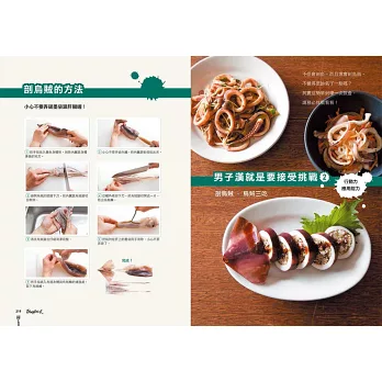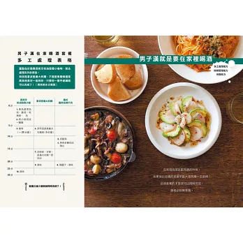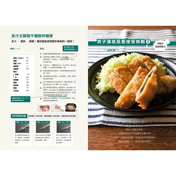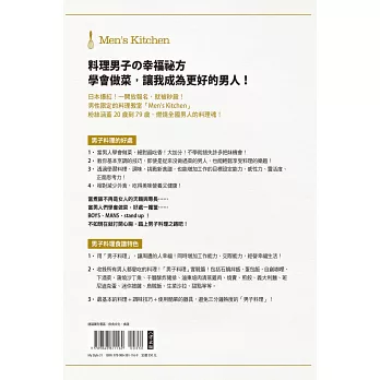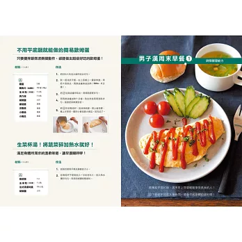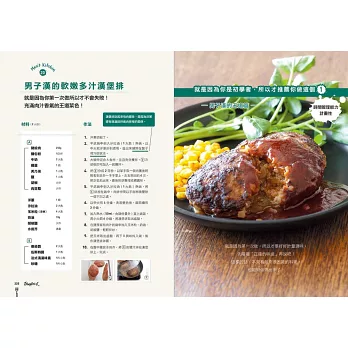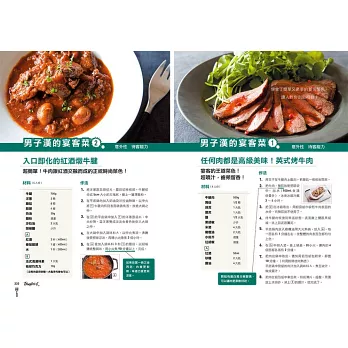 3.收錄所有男人都愛吃的料理!「男子料理」實戰篇!包括石鍋拌飯、蛋包飯、自創咖哩、下酒菜、蒲燒沙丁魚、千層酥炸豬排、滷東坡肉、清蒸雞肉、煎餃、義大利麵、班尼迪克蛋、迷你披薩、燒賣、烏賊飯、生菜沙拉、甜點等等。