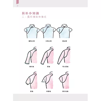 2. 備有長衫製作小知識,以圖解構領位、袖式、襟型等華服元素,讓入門者有初步了解,兼具實用價值。
