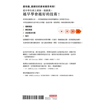 我們每天都得做出許多決定,這本書教我們分析當中的共同元素,引導我們細細思考。它所提供的技巧適合每一個人,不無論你幾歲!──丹.艾瑞利Dan Ariely│行為經濟學家,《不理性敬上》作者