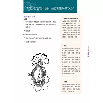 從此,我栽入HENNA的土壤裡,一點一點茁壯。也謝謝出版社願意將講義出版成書,也因為有出書計畫,讓我的人生也因此更加精采、豐富,也讓我認識許多同好,開心的分享繪畫心得。