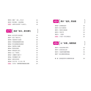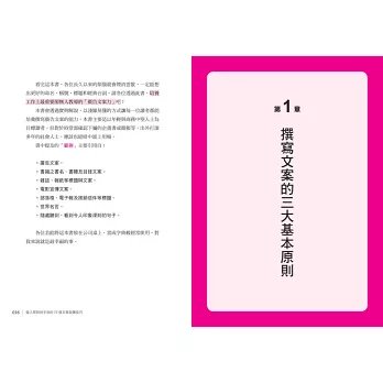 把上列三點當口訣,搭配書中提供9大面向、77個文案技巧 ,每逢文案卡關就拿出來念三遍,包管你文案力如日中天!