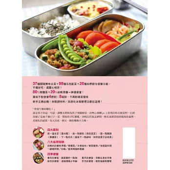 而原本只是在個人臉書上的分享,在成立了粉專之後,和許多熱情的朋友互動交流,有笑也有淚,聽到了許多朋友們帶便當苦手的各種心聲。心中的熱血萌發,我開始思考如何解決大家的問題,可以每天持續為心愛的人帶便當。這本書正是極光個人小小的心得集結,希望有系統、有效率地幫助朋友們,開始動手準備營養滿點、色彩豐富並且美味的四季便當。