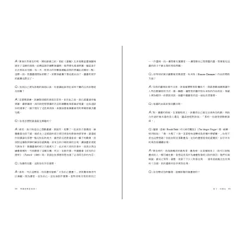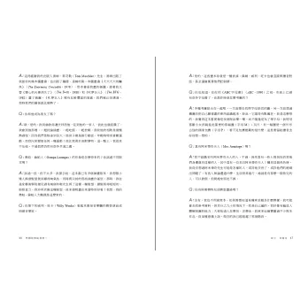 通常每本書的寫作都有設定對象,雖然我不知道這本書原來的寫作對象是什麼人,但馬庫斯的書讀來有如聽著現場訪談,他總是能找出最貼近被訪者的方式問題,有禮貌又不客套的切入重點,針對不同被訪者,他都設計了順序、話題、將各個時光背景不同的創作者,用讀者容易懂得的平臺展示。
