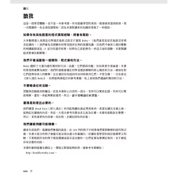 我們認為你的時間寶貴,不應該浪費在與新概念周旋不下的窘境中。《深入淺出Ruby》採取了專為大腦運作而設計的豐富視覺化風格,運用認知科學與學習理論的最新研究成果,精心建構出引發多重感知的學習體驗,讓你輕鬆瞭解Ruby,而且不容易忘記。