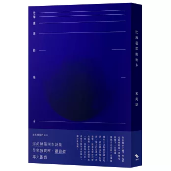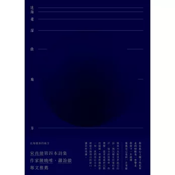 還來不及對世界說完的話,都沉積在回憶的海洋,遠方的浪帶來一些聲響,溫柔地震碎沉默的隔閡。詩人宋尚緯的第四本詩集著作《比海還深的地方》收錄了2015至2017年間創作的67首詩,全書分為兩部分,輯一以內心情感為創作出發點,低語傾訴的溫柔詩句與日常而生動的意象講述人與人生命碰撞時所產生的情感,諸如愛戀、遺憾、寂寞等;輯二將近年來的社會議題融入詩作之中,直白而口語的詩句裡蘊含濃烈的情感,如火山噴發前的能量蓄積,飽含著詩人對世界的關心與期許。