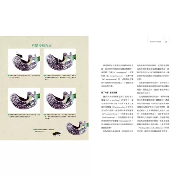 在這三年的努力中,從達爾文成功預測大彗星風蘭傳粉者的傳奇故事,到世界各地經典的蘭花授粉案例,我們逐一將眾多研究論文及觀察資料轉化為簡易好讀的文字,以便讓更多人能一窺授粉生物學的祕密,再加上精細的電腦繪圖的插圖,清楚傳遞出每個傳粉步驟的細節;更重要的是,為了讓更多人領略到蘭花的美麗與藝術性,本書更有別於一般科普書籍以照片為元素來傳達與講述,反而採用水彩手繪圖創造情境與美感。這也呼應了在達爾文那個年代總是利用石版畫做為蘭花觀察記錄的時代背景。