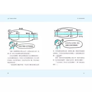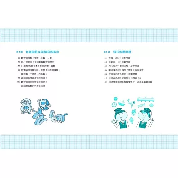 本書第一課介紹「數學真奇妙」,像是為什麼乘法的答案會變小?為什麼分數的分母不一定能加在一起等。第二課則是「有趣的數字」用有趣易懂的圖像說明數字的排列規則、什麼是約數與質數?奇妙的圓周率。第三課則是有趣的應用:龜鶴同籠、分配問題、水流問題、等差數列、兩人會在幾分鐘後相遇(速率問題),這些問題其實只要畫圖就能輕鬆解出。