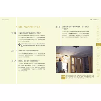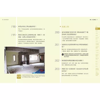 2、窗戶漏水怎麼辦?木地板踩踏時發出聲音怎麼辦?面對裝修出包狀況本書直接提出解決方法,完全不懂建築設計的新手屋主也能照著方法解決危及狀況。