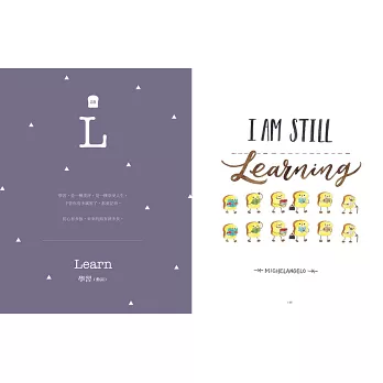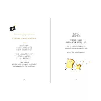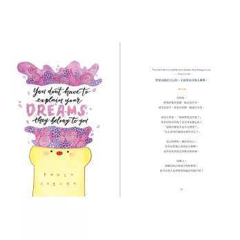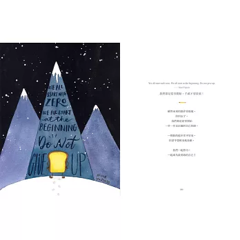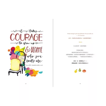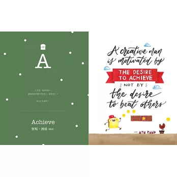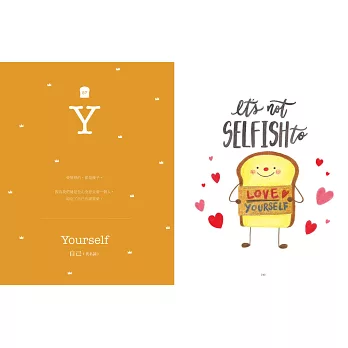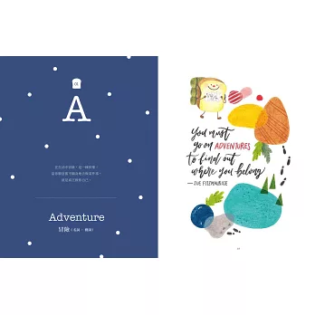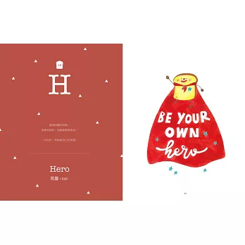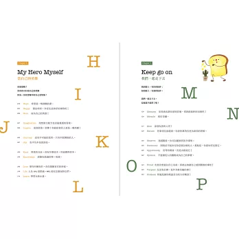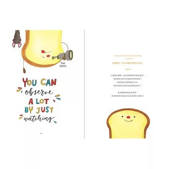 ■當可愛吐司將,遇見療癒英文美字,交織出動人的勵志詩篇。本書以勇敢做自己、追求夢想為主題,以26個英文字母為開頭,從A 到Z,收錄激勵人心的60句名人語錄,再加上療癒人心的吐司將可愛插畫。