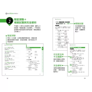 學習完一小類單字後,馬上可以利用緊接在後的「隨堂測驗」,即時檢測學習成效!而全真3回模擬試題,完全依照「日本國際教育支援協會」及「日本國際交流基金會」公布來出題,忠實呈現試題原貌,讓您厚植實力、加強臨場經驗、增加解題速度和功力,保證過關!