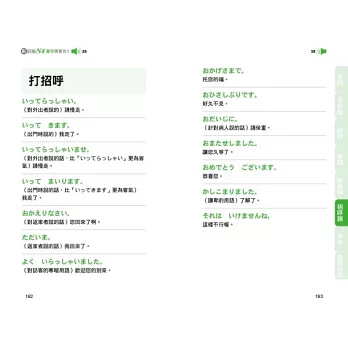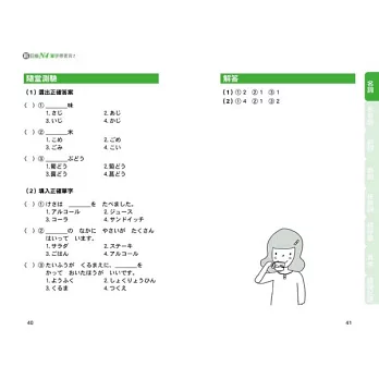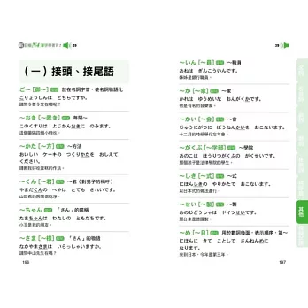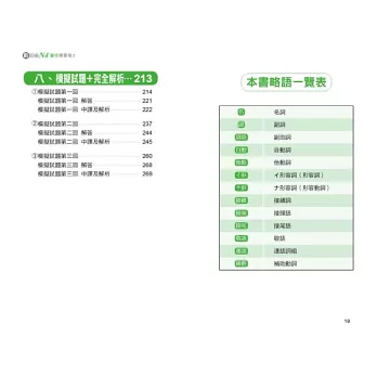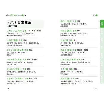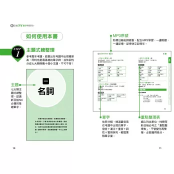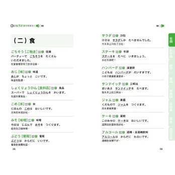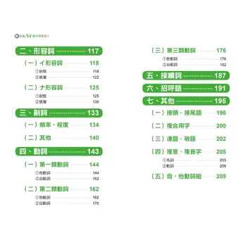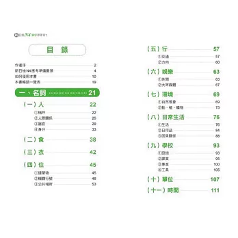 本書將所有N4單字依照詞性的不同分成七大類,分別是「名詞」、「形容詞」、「副詞」、「動詞」、「接續詞」、「招呼語」、「接頭、接尾語‧複合用字‧連語、敬語‧複意、複音字」。接著再在各大類下細分各個小項目,例如「名詞」下可分為:人、食、衣、住、行等等,群組記憶單字,好記不遺漏!