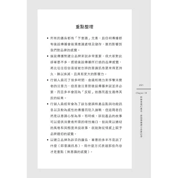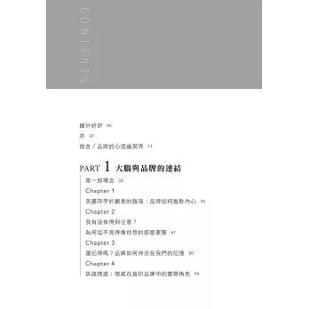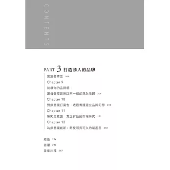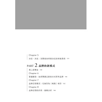 3. 本書第一部著重說明理論,第二部則整合品牌幻想,第三部則將品牌幻想落實到行銷的實務面(包括如何將品牌幻想應用到網路溝通媒介)。架構完整,且理論與實務兼具,實用性與參考價值極高。