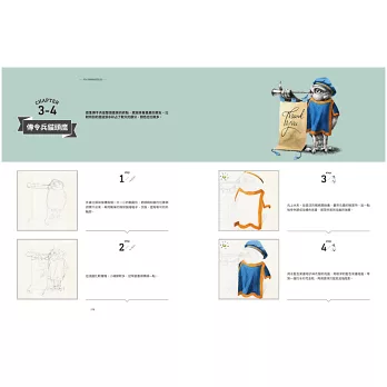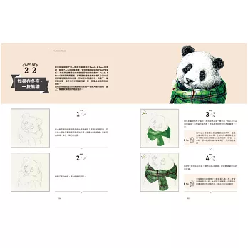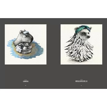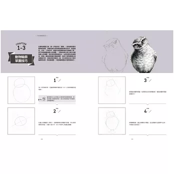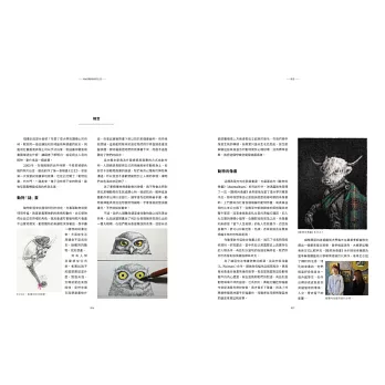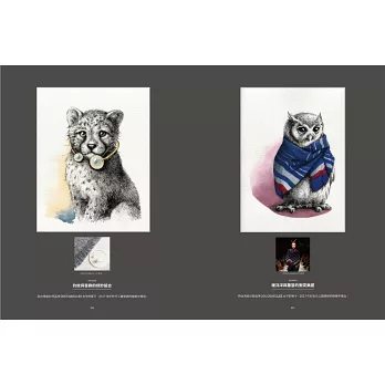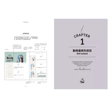 CHAPTER1從最基礎的沾水筆用具、怎麼用交叉線條打造光影效果,以及基礎的草圖技巧講起,萬事起頭難,先掌握好基本功接下來才能走得順。CHAPTER2就正式進入沾水筆創作,我設計了6個運用不同技巧的練習,從一隻完整的貓頭鷹開始,到沾水筆搭配水彩的創作,最後還有用滴管來作畫的部分。CHAPTER3是精選我去年《去你的貓頭鷹》畫展,看看用單一主題(貓頭鷹)來創作,會出現多少種可能性;另一方面我也選出幾種稍微進階一些的畫作來剖析、練習。CHAPTER4則是以「時尚」為主題,試試如何將已經呈現既定印象的時裝,與幾乎不可能穿上這些服飾的動物結合。CHAPTER5是重頭戲《動物肖像畫》系列,完整收錄了這系列的所有畫作,包含罕見的創作前試作,以及2017年為此系列畫的新作。CHAPTER6,在最後我想介紹運用鋼筆的創作,與沾水筆不同,鋼筆的線條更加靈動,也適合外出創作。