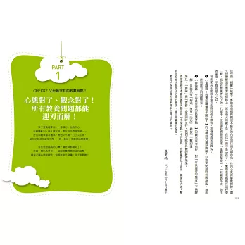 本書的第一部分【理論篇:父母最常有的教養盲點!】是教育的「心法」。我們的心態對了、觀念對了,才有辦法辨別什麼是正確、什麼是錯誤的教育觀念。從正確觀念延伸出來的方法,才不會對孩子造成傷害。