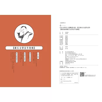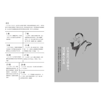 介紹漱石各個時期的文學作品及人生經歷,幫助讀者更深入了解漱石與本書《心》的著書背景。
