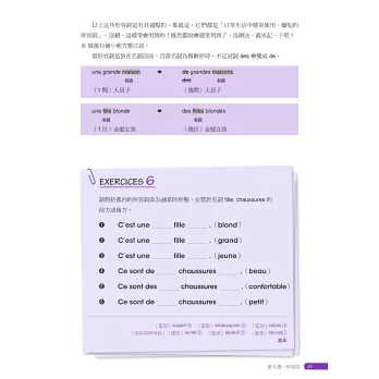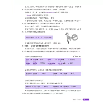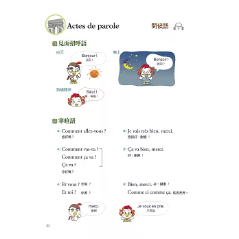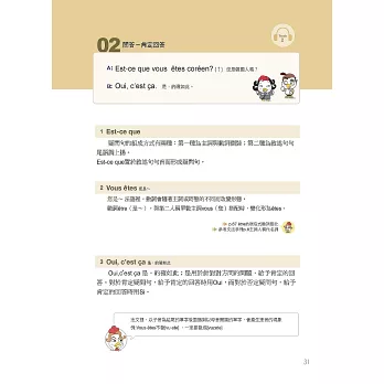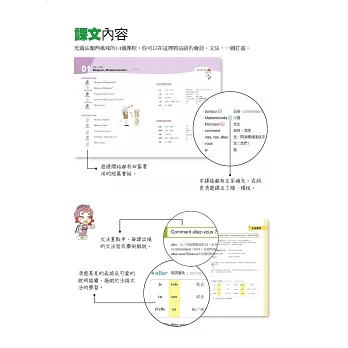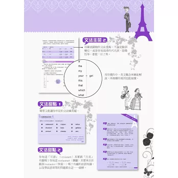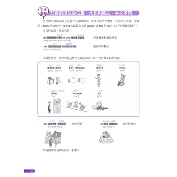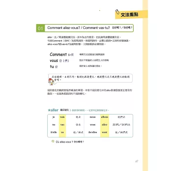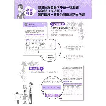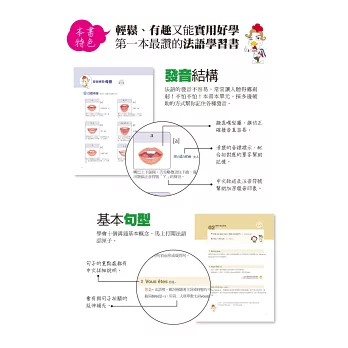 擷取學習要點,不時以簡明扼要的表格、插圖協助理解法語的文法。不論是法語中令人難懂的特殊人稱六變位、或是陰陽性等等等的文法,都能一目了然。