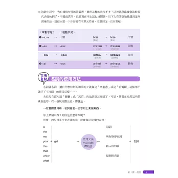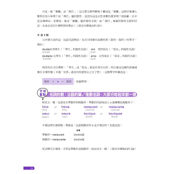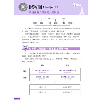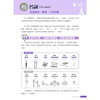 在發音篇之後,便從最基本且最重要的「名詞」開始,接著「冠詞」「形容詞」「動詞」等,一直到法語各時態的用法來一一做解說。所以,與法語「陰陽性」相關的重點都會在一開始進行系統的教學,並循序漸近講解更深一層的課題。