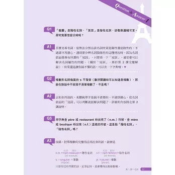 你知道你吃過的「可頌」或「牛角麵包」(croissant)其實跟「月亮」有關嗎?你知道restaurant(餐廳)一詞其實來自於動詞restaurer(恢復…、恢復精神)嗎?本書有針對初學者在法語學習上所遇到的疑惑與各種知識來做解答,還包含像是法文歌詞上的問題、查法語字典時會遇到的狀況等等,讓你更通盤學好法語。