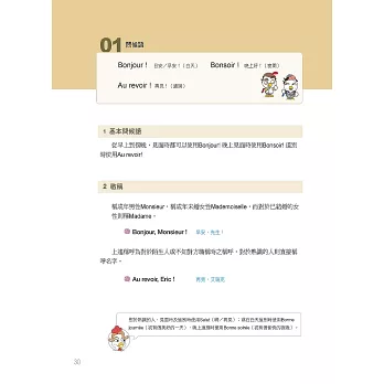 你知公雞為什麼是法國民族的代表象徵嗎?你知道什麼時候去凱旋門參觀,可以見識到更盛大的精采活動呢?本書在每課末都有針對法國文化作趣味性的解說,讓你不只是單單學習法語而已。更能快樂地通盤了解法國。