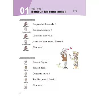第三單元開始正式課文,這個部分分為機能性分明的14課,從最初的問候、詢問時間、詢問日期、指示代名詞的使用、上街購物、享用美食、撥打電話等生活實用主題課程。循序漸近的學習,讓你能像爬階梯般地,一步一步地穩固法語能力。